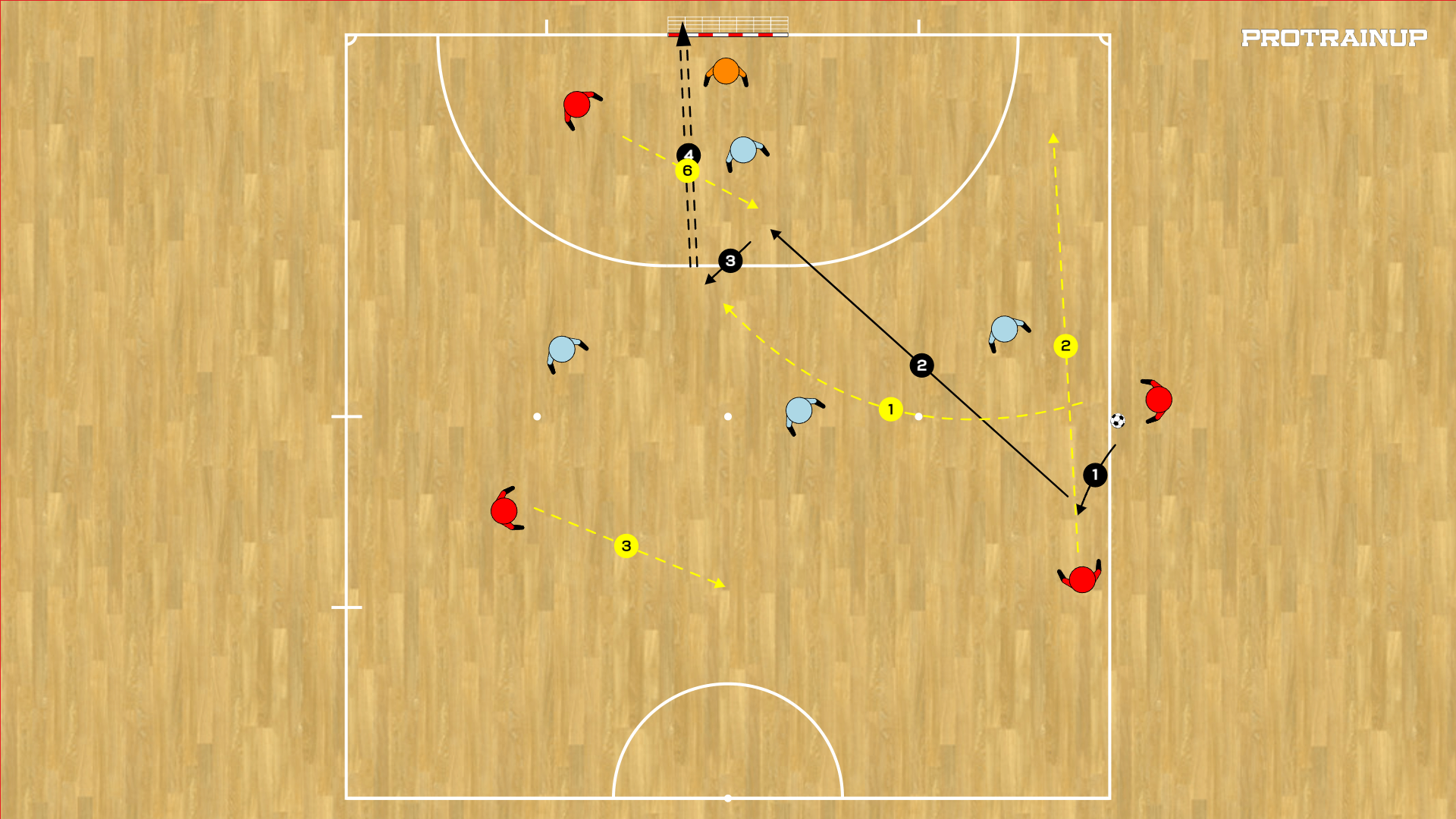 Zawodnicy ustawieni jak na rysunku. Piłkę wznawia z miejsca zawodnik (czerwony),i podaję ja na wbiegającego partnera,. który zagrywa do wychodzącego PIvota. Pivot oddaję ja do partnera który rozpoczyna akcje i następuje finalizacja.